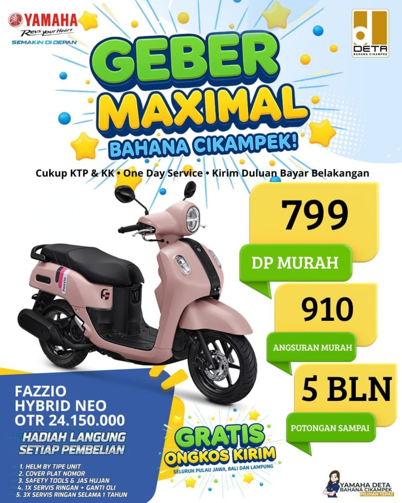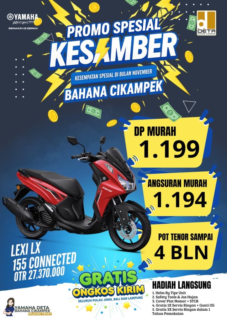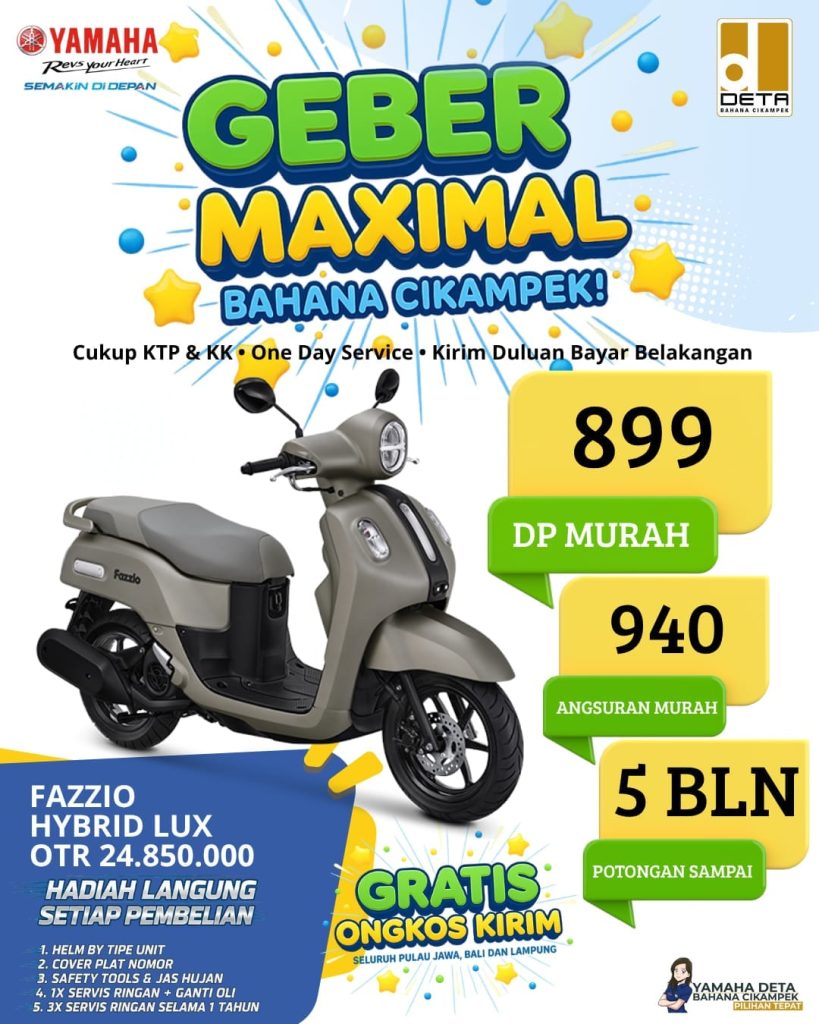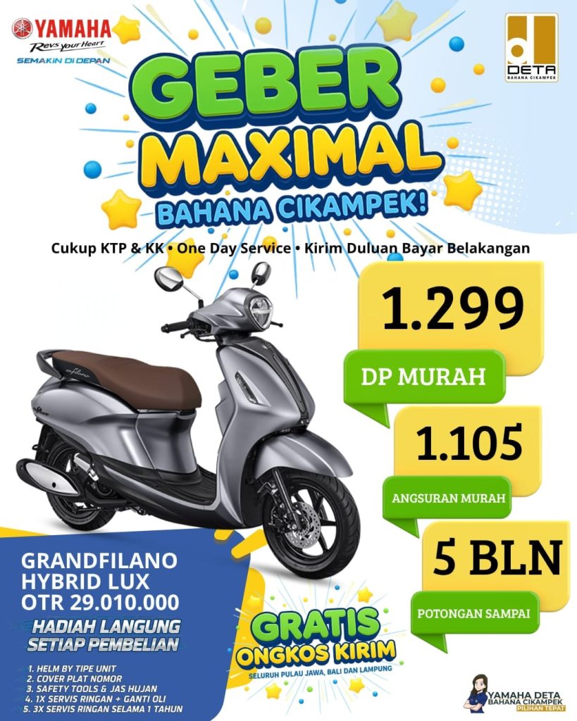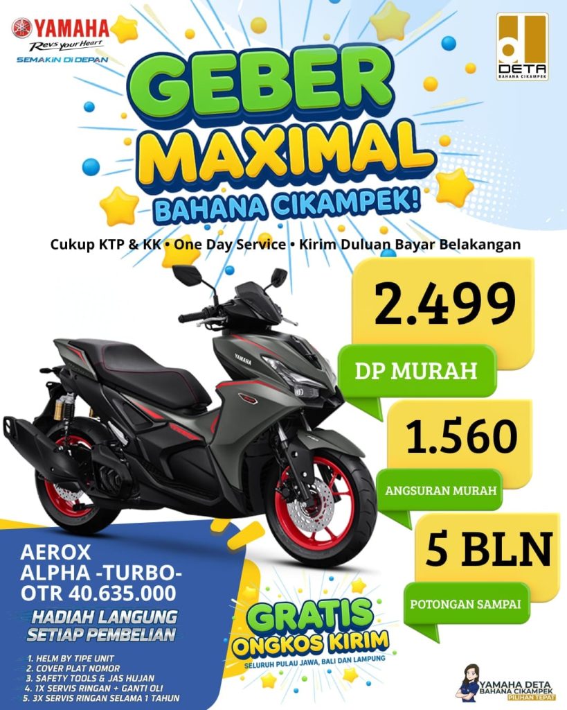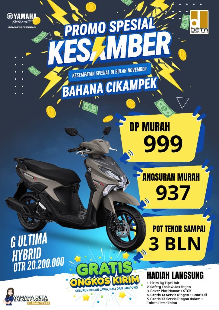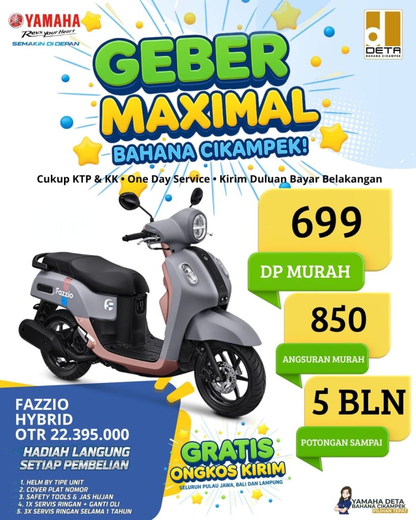 Yamaha Bahana Karawang Official (Deta Group) adalah salah satu dealer resmi Yamaha Indonesia terbesar dan terpercaya di wilayah Jawa Barat. Melayani seluruh area dengan komitmen memberikan kemudahan dalam pembelian sepeda motor Yamaha secara online melalui situs resmi kami. Temukan berbagai pilihan produk unggulan dan promo menarik yang tersedia untuk setiap unit.